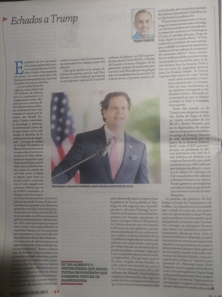 La posición del gobierno de Jerí frente a Trump fue entreguista y de rodillas. La experiencia ha mostrado que, cuando se actúa así, Trump quiere más; Europa se inclinó y ahora quiere quedarse con Groenlandia. Igual está pasando en nuestro país; tras esas tres entregas el embajador Navarro echa barro con ventilador contra las inversiones chinas en Perú como si fuera un influencer achorado, en total intromisión en asuntos peruanos. Hay muchas cosas por mejorar en cuanto a las inversiones chinas en Perú, pero eso es un asunto nuestro y de nadie más, menos de Estados Unidos cuya postura frente a China es “sácate tú para ponerme yo”. Mientras tanto, Keiko Fujimori se la ha jugado defendiendo a este Jerí sinvergüenza y López-Aliaga se ha querido presentar como amigazo de Trump y su banda. Urgentemente necesitamos recuperar autoestima nacional y defensa de nuestra soberanía.